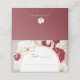 An elegant place card featuring ruby-red roses and soft white florals,