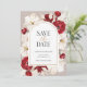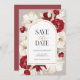 A romantic Save the Date card adorned with ruby-red roses and soft white florals.
