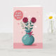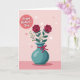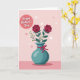 This card features a soft pastel illustration centered on a teal-blue vase that feels gently grounded and steady. A crimson ribbon is tied around the vase, its loops and tails curving like a small romantic gesture ❤️. Two large ruby-red flowers rise from the opening, with curled petals that look velvety and carefully layered, leaning slightly toward each other as if sharing a quiet moment. Thin green sprigs weave between the blooms, dotted with tiny white berries that add a light, friendly touch 🌼. The background is blush pink, sprinkled with crisp white and soft coral circles that read like confetti drifting across the scene. In the upper-left corner, a coral-pink circle contains the greeting text in white lettering, set neatly within the round shape. The teal vase sits near the lower center, while the red ribbon and deep red blossoms stand out strongly against the pale pink backdrop.