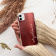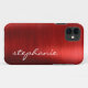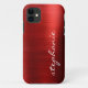 This trendy phone case features a ruby red faux brushed metal foil background. Personalize it with your name in white handwriting-style brush script.
