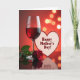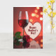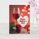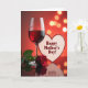 On the front of the card a tall clear glass sits on the left, filled with ruby-red liquid that catches the warm light like a quiet toast. A single deep red rose rests nearby, its velvety petals and dark green leaves arranged as if set down with care by someone who lingered a moment longer ❤️. On the right, a glowing heart shape becomes the focal point, giving the scene a gentle, affectionate pull like a close hug. Inside the heart, the words “Happy Mother’s Day!” appear centered in light-colored lettering that stands out clearly against the bright interior. The arrangement sits on a dark, glossy surface that reflects the glass, the rose, and the heart, adding a soft mirror effect. Behind everything, the background fades into a rich red haze with scattered golden circles of light, like distant candles at a small celebration 🌼. The heart’s edges look softly illuminated, and the warm highlights ripple across the reflective tabletop.