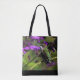 Tote bag featuring a beautiful female ruby-throated hummingbird sitting in purple flowers. Photo taken by Karla Chrast.