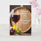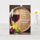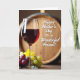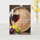 This design shows a tall stemmed glass filled with deep ruby-red liquid in the foreground, catching warm light like a shared toast between close companions ❤️. At the base of the glass sit plump grapes in two tones—translucent green and dusky red—nestled together as if leaning in toward one another. A single bright yellow autumn leaf rests among the fruit, adding a gentle seasonal touch 🌼. Behind them, the softly blurred curve of a wooden barrel creates a cozy, rustic setting that feels like an intimate corner of a cellar. The scene sits on a textured wooden tabletop whose grain and shadows add warmth and quiet romance. Over the image, a flowing handwritten-style message appears in crisp white, placed across the upper area so it stands out against the darker background. The glass shows a small highlight along its rim and a faint reflection down the bowl, while the grapes have tiny points of shine that make them look freshly picked.