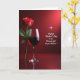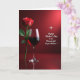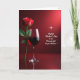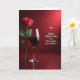 Designed with a romantic still-life look, the card shows a single deep-red rose standing on the left, its green stem and leaves leaning slightly as if offering a quiet hello ❤️. Next to it sits a tall, clear wine glass filled with dark ruby liquid, catching soft highlights that make it feel like a shared toast between close companions. Both objects rest on a glossy, reflective surface that mirrors their shapes and adds a gentle, intimate mood. The background stays in layered reds, shifting from darker tones near the bottom to a lighter glow toward the upper right, like candlelight fading into the room. On the right side, a short message appears in white flowing lettering, set against the red field so it stands out without overpowering the scene. A small star-like sparkle near the upper right adds a subtle celebratory touch 🌼. The rose’s petals are velvety and shaded, and the glass rim is traced with a thin line of light against the red backdrop.