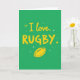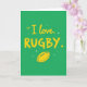 This card features the big phrase “I love RUGBY” in sunlit yellow lettering that looks brush-painted and slightly rough around the edges, giving it lively energy. The words sit across the upper two-thirds of the front, with “I love” leading into “RUGBY” as the main focus, like a shout of affection for the game ❤️. Beneath the text, a stylized rugby ball in the same yellow sits near the lower center, acting like a visual anchor. Everything rests on a deep emerald-green background that feels like a rugby pitch, making the yellow pop strongly. Scattered around the message are tiny white hearts, small asterisks, and round dots, like confetti floating through the air, adding a sweet, flirty touch 🥰. The white hearts drift across the green space in a way that makes the declaration feel like it’s meant for someone special, not just the sport. The overall layout stays simple: yellow text up top, yellow ball below, and little white marks sprinkled evenly across the background.