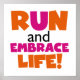 If you love to run, run 5Ks, 10Ks, half marathons, or marathons, you'll love this colorful text design in orange and hot pink that reads Run and Embrace Life! Run and Embrace Life T-shirts, hoodies, magnets, buttons, cards, stickers, key chains, and lots of other items for runners who love a bright, colorful running design!