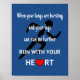 Your legs are heavy, your lungs are bursting, but the race isn't over yet. Determination will keep you going as you run from your heart. This motivational poster has white lettering on a blue background with the silhouette of a runner. Remember this quote when you are running, whether indoors on the treadmill, racing on the track, or out on the open road.