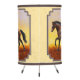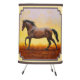 A painting of a dark bay wild stallion galloping across a grassy plain. Accented with a matching yellow background.