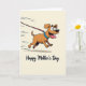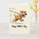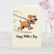 This card features a cheerful cartoon dog with warm brown fur and wide, bright eyes, caught mid-run with its pink tongue hanging out in a big grin ❤️. A blue collar circles its neck, and a deep red leash stretches off the edge, hinting at a close companion just out of view being eagerly pulled along. The dog sits centered on a pale cream background, leaving lots of open space that makes the motion feel even faster. Thin black motion lines sweep horizontally around its body, like the air is rushing past as it dashes forward with friendly, affectionate energy. The overall color palette stays simple and cozy, mixing soft browns with that pop of blue and red for a lively contrast. Near the bottom, the words “Happy Mother’s Day” appear in dark lettering, placed neatly beneath the running dog and easy to read 🌼. The dog’s ears lift back slightly as if it’s racing toward someone it’s excited to see. The text sits centered below the illustration on the cream background in dark ink.