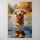 Golden Retriever running through a stream in autumn