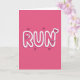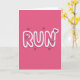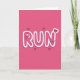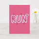 This card features the word “RUN” placed right in the center in big, rounded, 3D-style letters. The letters are magenta with a thick white outline, and a darker pink shadow behind them adds depth and a sense of motion. The background is a solid hot pink, so the message stands out right away. Small hearts in different sizes are scattered around the word, and a few are tucked inside the letters for a sweet surprise. There are larger heart shapes near the “R” and the “N,” with tiny hearts nested inside them, which adds a cute, caring touch. The text is in chunky block lettering rather than script, and it fills most of the middle of the card. Overall, it feels like a fun nudge to hurry toward someone you care about ❤️
