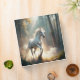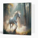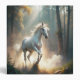 A white horse running through a forest