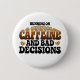 Funny quote badge reading "Running On Caffeine And Bad Decisions" in a fun black font other than the word caffeine which is in brown. Below the quote is a couple of simple coffee beans.