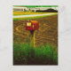 A beautiful, richly colored sketch/painting style image of a rustic, red metal mailbox out in the country. This is rural farm town, as seen by the recently plowed and harrowed farm field and large agricultural barn outbuildings in the background.