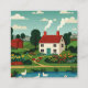 A country house with a red roof and smoking chimneys, surrounded by a blooming garden.