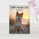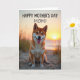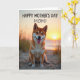 This card shows a medium-sized dog with russet and creamy white fur sitting on a sandy beach, its pointed ears alert and its mouth open in a friendly grin with a pink tongue showing ❤️. Warm sunset light glows behind the dog, forming a soft halo around its fur and giving the scene an affectionate, “I’m glad you’re here” kind of closeness. The sun hangs low near the horizon, casting apricot and amber tones across the sand and water like a shared evening walk. Thin dune grasses poke up around the foreground and edges, adding a gentle, natural frame to the scene. Across the top, the text reads “HAPPY MOTHER’S DAY MOM!” in dark lettering that stands out clearly against the bright sky. The words sit centered above the dog, leaving the beach view open and calm beneath them 🌼. In the distance, the water catches the sinking sun as a narrow, shimmering stripe of light.