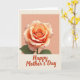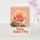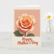 Soft colors and a large stylized rose fills the upper two-thirds of the card against a muted peach background, its layered petals opening outward with a gentle, affectionate feel ❤️. The flower’s center glows coral, shifting into warm orange and then creamy peach toward the edges, with faint blush-pink touches along the tips that look softly lit and slightly translucent. Below the bloom, a deep green stem and two green leaves ground the design, adding calm contrast to the warm petals. The lower third changes to a lighter creamy beige panel that gives the message room to breathe. Centered on this lower section, the words “Happy Mother’s Day” appear in warm russet lettering with flowing, expressive strokes. The generous spacing and smooth curves of the text pair neatly with the rose above, like a quiet gesture of closeness and care 🌼. A subtle horizontal divide separates the peach upper area from the beige lower panel, with the rose hovering above and the message sitting clearly beneath it.