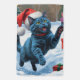 A graceful Russian Blue Cat runs elegantly through the snowy winter scene, wearing a festive red Christmas hat. This charming design highlights the breed’s plush blue-gray coat, striking green eyes, and gentle personality while capturing the warmth and joy of the holiday season. A delightful winter moment full of festive cheer.