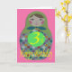 3rd Birthday card with an image of a classic shaped Russian Doll with colored circles, on a pink background.
