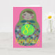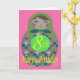 8th Birthday card with an image of a classic shaped Russian Doll with colored circles, on a pink background.