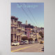 A street view in San Francisco, California, showcases a row of parked cars along the roadside. The architecture features classic San Francisco houses with detailed facades. In the background, Coit Tower stands prominently on a hill, surrounded by trees and other buildings. Overhead, power lines stretch across the clear blue sky.