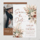 Set the tone for your big day with this Rust Boho Terracotta Save The Date Card. This design features a stunning arrangement of dried florals, eucalyptus, and feathery pampas grass in a warm, earthy color palette of terracotta, cream, and dusty sage.