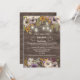 Beautiful wedding elopement dinner invitation designed with a rustic wood background. Rust, purple, and ivory cream-colored watercolor flowers, sage green leaves, and string lights and lanterns top of this country wedding design.