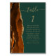 The left-hand edge of this elegant modern wedding table number card features a burnt orange and rust watercolor agate border trimmed with faux gold glitter. The word "table" appears in gold-colored handwriting script on a dark green background. Add the names of your guests who are assigned to each table.