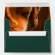The inside of this elegant modern wedding invitation envelope features a watercolor agate design in shades of burnt orange and rust, trimmed with faux gold glitter. Customize the back flap with the names of the bride and groom in gold colored handwriting script and return address in copperplate font on an emerald green background.