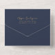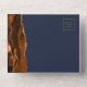 The left-hand edge of this elegant modern all-in-one wedding invitation and RSVP features a burnt orange and rust watercolor agate border trimmed with faux gold glitter. The customizable text combines gold-colored modern handwriting and sans serif fonts on a navy blue background. The return address appears on the outside flap and on the reverse side of the RSVP.