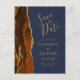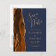 This elegant modern save the date postcard features a burnt orange and rust watercolor agate border trimmed with faux gold glitter. Easily customize the gold-colored text on a navy blue background. On the reverse side, edit the customizable return address and enter your wedding website URL to generate a QR code your guests can scan to learn more about your upcoming event.