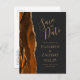 This elegant modern save the date postcard features a burnt orange and rust watercolor agate border trimmed with faux gold glitter. Easily customize the gold-colored text on an off-black background. On the reverse side, edit the customizable return address and enter your wedding website URL to generate a QR code your guests can scan to learn more about your upcoming event.