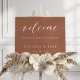 Welcome guests to your wedding with this elegant sign featuring white typography on an earth tone rust background with "welcome" at the top in elegant handwritten calligraphy script, and "...to our happily ever after" and your names and wedding date beneath.