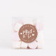 Punny wedding favor stickers feature "mint to be" in white hand lettered script accented with hearts, on an earth tone rust background. Personalize with your names and wedding date.