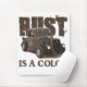 Rusty rat rod pickup in front of large word 'RUST' with 'is a color' below it