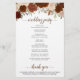 These wedding programs are elegant and tasteful, while still being budget friendly. The design features a bevy of hand painted watercolor roses in shades of rust orange, burnt umber, and coral peach, surrounded by eucalyptus leaves and garden foliage. The typography features lacy script calligraphy, and there is room for details on the ceremony, the bridal party, and a short thank you.