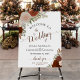 This beautiful sign is a wonderful way to welcome guests to your wedding celebration. It features a lovely hand painted watercolor design with roses and foliage in autumn shades of rust orange, coral peach, and burnt umber. The lettering is done in elegant script calligraphy. The rustic boho chic design is perfect for a fall wedding.