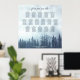 This beautiful wedding seating chart has table assignments for 160 guests at 16 tables (10 people per table.) The design is rustic yet elegant with a mountain hillside shrouded in mist or fog and covered with blue spruce or pine trees. There is a lacy script calligraphy title reading "please find your table" as well as space for the names of the couple and the wedding date. Perfect for an outdoor or mountain destination wedding.