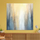 This rustic abstract wall art showcases blue and brown hues with warm yellow stripe accents. The weathered and distressed look blends seamlessly with farmhouse and vintage decor styles. It creates a bold yet cozy focal point for any room.