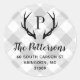 Custom round return address stickers personalized with your family monogram and address. This modern rustic design features your monogram initial with deer antlers on a gray and white buffalo check background. Use the design tools to change the background color and fonts to further customize your own unique design. Perfect for addressing holiday cards, wedding stationery and more.