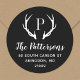Custom round return address stickers personalized with your family monogram and address. This modern rustic design features your monogram initial with deer antlers in black and white colors. Use the design tools to change the background color and fonts to further customize your own unique design. Perfect for addressing holiday cards, wedding stationery and more.