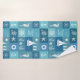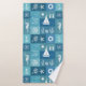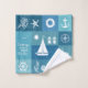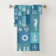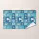 Vintage Nautical Icons Board Pattern Bath Towel Set. This design features a coastal board checker with retro textured patchwork white summer symbols light blue seamless pattern designs in a mix of blue, white, aqua, and turquoise, the towels highlight boat anchor, seahorse, corals, shell, lack house and boat. This vintage nautical icons board monochrome blue Vector Pattern with classic turquoise blue and white color scheme will be perfect as personalized gift.