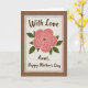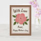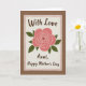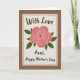This card features a softly shaded coral-pink rose at the center, its petals curling in gentle spirals that feel tender and affectionate ❤️. Deep green leaves sit on either side, giving the flower a balanced, caring look, like a quiet gesture between close family. The rose is placed on a cream rectangular panel with slightly rough, torn-style edges, outlined by a thin pink border that adds a sweet touch. Near the top of the panel, the words “With Love” appear in flowing deep-brown lettering, spaced comfortably above the flower. Beneath the rose, a second line of deep-brown text reads “Aunt, Happy Mother’s Day,” aligned neatly to follow the panel’s shape. The panel rests on a warm earthy-brown background with a subtle paper-like texture, making the center design feel like a keepsake note 🌼. The overall colors stay soft and cozy—coral, green, cream, and brown—with the pink outline clearly tracing the panel’s edges.