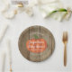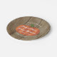 These adorable rustic fall baby shower paper plates features a cute pumpkin and the words "A LITTLE PUMPKIN IS ON THE WAY!" in white curved text, and the name of the mom-to-be and the baby shower date in white, all on a faux wood background. Customize all the wording on this design.