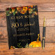 Beautiful rusty orange and dark burgundy autumn fall flowers and pumpkin borders with strings of golden twinkle lights over a dark brown barn wood background making a charming elegant 21st, 30th, 40th, 50th, 60th, 70th, 75th, 80th, 90th 100th (any age) years birthday party guest book with a trendy handwriting gold typography script. +++++++++ Easy to personalize with your details! Suitable for traditional rustic country farmhouse outdoor backyard family and friends gatherings.