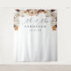 Rustic wedding tapestry featuring a top border of watercolor flowers and foliage in shades of ivory, cream, brown, and rust-orange. "Mr. and Mrs." is displayed in modern calligraphy with your last name and wedding date shown below. The rustic autumn floral tapestry is perfect to use as a backdrop for photos at your fall wedding.