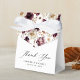 Rustic fall wedding favor boxes featuring the phrase "Thank You" displayed in an elegant calligraphy script with your names and wedding date displayed below. The elegant wedding favor box features a pattern of watercolor flowers and foliage in shades of marsala, burgundy, purple, ivory, cream, brown, and rust orange. Designed to coordinate with our Rustic Autumn Floral wedding collection.