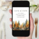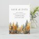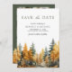 Amaze your guests with this forest theme save the date featuring beautiful pine trees and modern typography with QR code for wedding website. Simply add your event details on this easy-to-use template and adorn this card with your favorite photos to make it a one-of-a-kind save the date card.