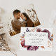 Elegant fall-themed save the date featuring watercolor autumn flowers and foliage in shades of marsala, burgundy, purple, rust-orange, and brown. "Save the Date" is displayed in a modern calligraphy script with your names and wedding details shown below. The card reverses to display your full-bleed, horizontal engagement photo. The fall floral save the date coordinates with our Rustic Autumn Floral wedding collection.