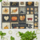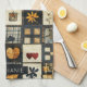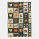 This autumn patchwork quilt-inspired kitchen towel features warm seasonal motifs arranged in rustic squares. Pumpkins, birds, hearts, and floral branches appear alongside plaid and checkerboard blocks, with stars, snowflake-like shapes, and baskets adding charming variety. Rendered in earthy tones of orange, brown, cream, red, and black, it captures the cozy farmhouse aesthetic of the harvest season. Perfect for Thanksgiving, rustic country décor, fall crafts, and anyone who loves primitive folk art style.